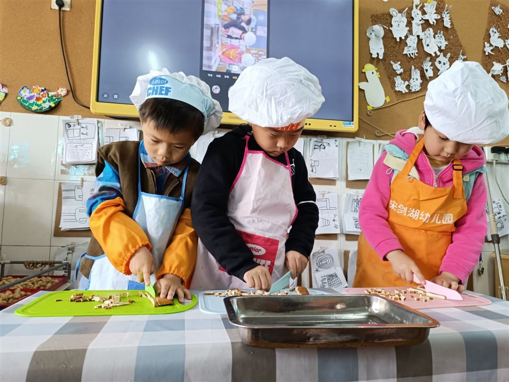 生活区中,孩子们分组制作鸡蛋饼。从互相协助穿戴围裙,到共同寻找搅拌工具、处理食材,整个过程既有明确分工,也有默契配合。教师在旁适度引导,鼓励幼儿尝试使用不同工具解决问题,使劳动过程成为社会性发展与认知学习交织的真实课堂。